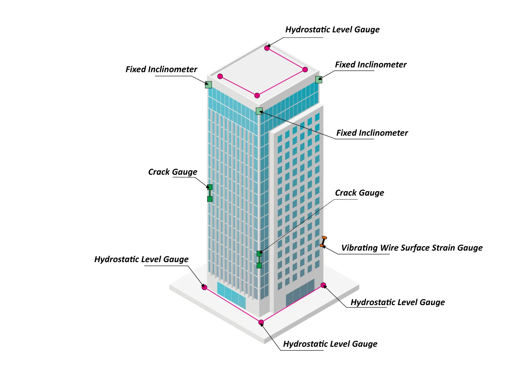 Використовуючи такі технології, як Інтернет речей, мобільний зв’язок і хмарні обчислення, він проводить автоматизований моніторинг безпеки зовнішніх деформацій і тривимірних змін просторового положення таких конструкцій, як висотні будівлі, довгопролітні будівлі, будівлі високого ризику та старовинні будівлі. Він реєструє стан будівель протягом усього життєвого циклу, контролює ризики та забезпечує здорове обслуговування будівель.