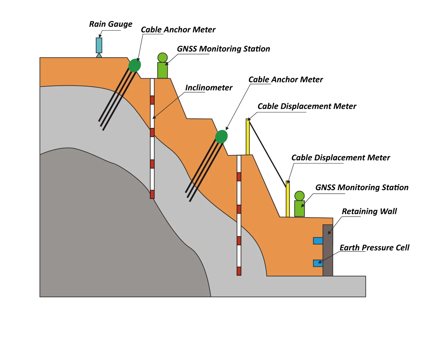 Моніторинг глибинного зміщення, зміщення поверхні, моніторинг анкерного кабелю, моніторинг опадів, моніторинг рівня ґрунтових вод, звукова та візуальна сигналізація тощо.